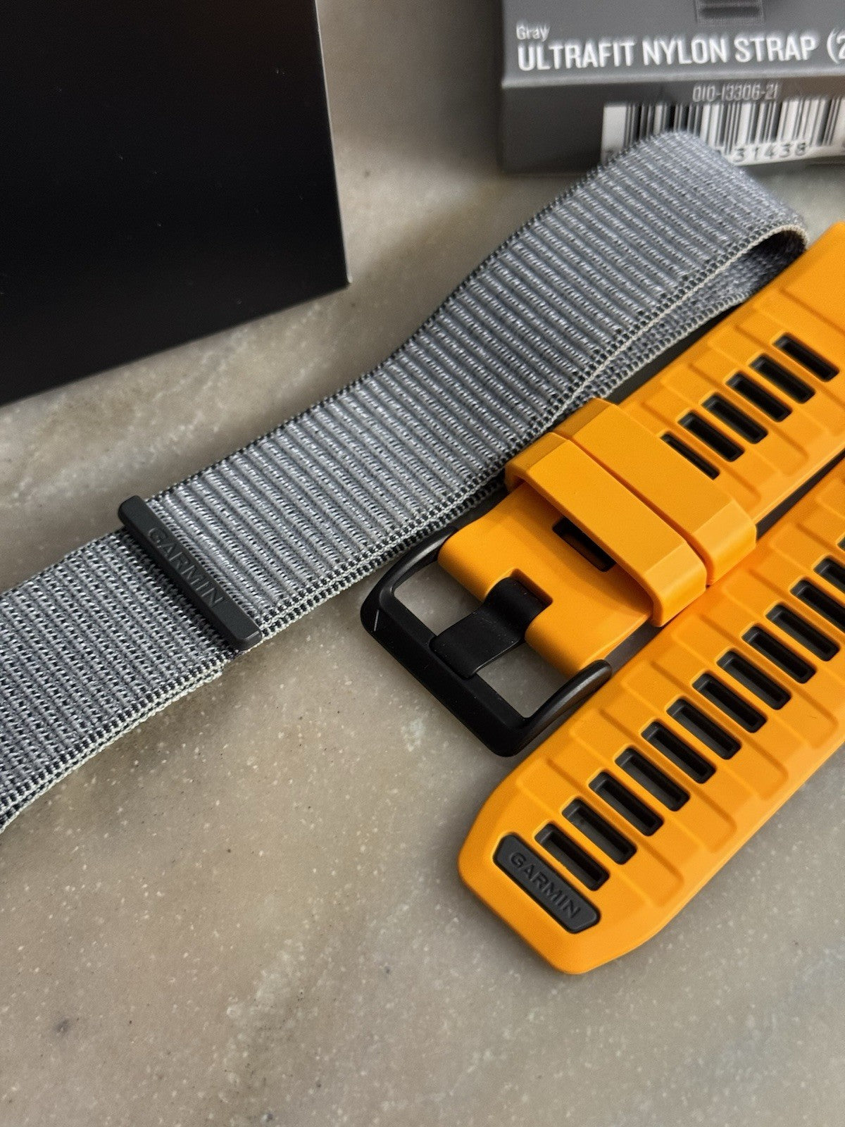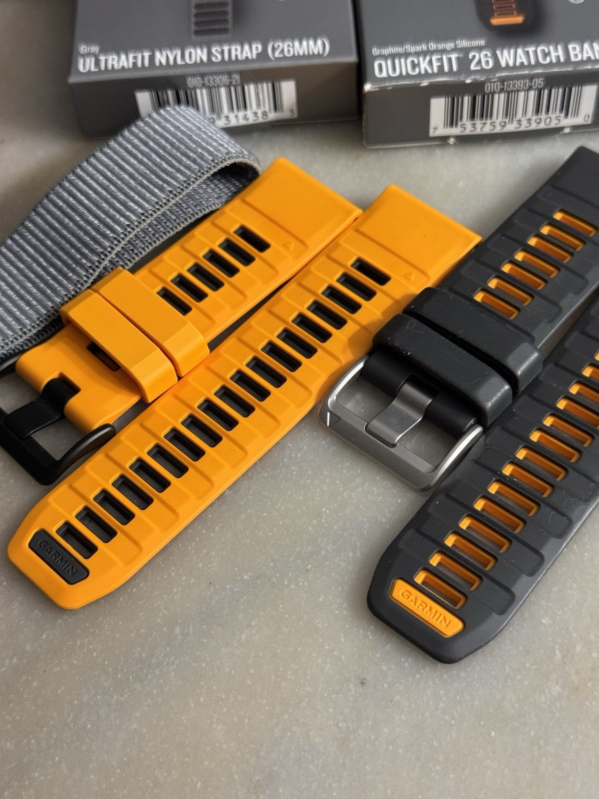 Included are two original Garmin silicone Quickfit 26mm straps, Ultrafit 26mm nylon strap, titanium bracelet, and original charging cable.